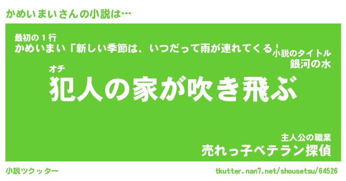 かめいまいさんの小説は… オチ『犯人の家が吹き飛ぶ』最初の1行『かめいまい「新しい季節は、いつだって雨が連れてくる」』主人公の職業『売れっ子ベテラン探偵』 ツクッター #小説ツクッター http://tkutter.nan7.net/shousetsu/64526/