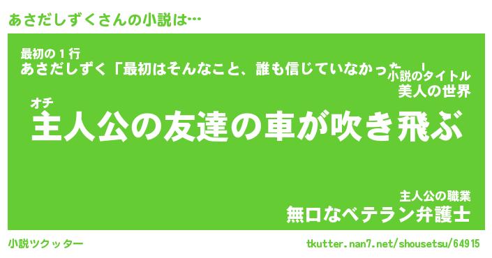 あさだしずくさんの小説は… オチ『主人公の友達の車が吹き飛ぶ』最初の1行『あさだしずく「最初はそんなこと、誰も信じていなかった。」』主人公の職業『無口なベテラン弁護士』 ツクッター #小説ツクッター http://tkutter.nan7.net/shousetsu/64915/