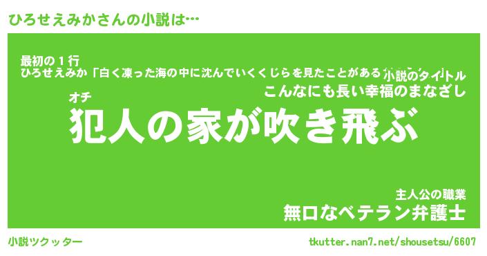 ひろせえみかさんの小説は… オチ『犯人の家が吹き飛ぶ』最初の1行『ひろせえみか「白く凍った海の中に沈んでいくくじらを見たことがあるだろうか。」』主人公の職業『無口なベテラン弁護士』 ツクッター #小説ツクッター http://tkutter.nan7.net/shousetsu/6607/