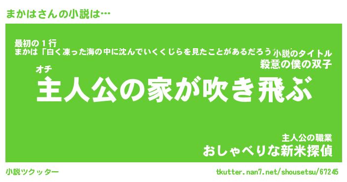 まかはさんの小説は… オチ『主人公の家が吹き飛ぶ』最初の1行『まかは「白く凍った海の中に沈んでいくくじらを見たことがあるだろうか。」』主人公の職業『おしゃべりな新米探偵』 ツクッター #小説ツクッター http://tkutter.nan7.net/shousetsu/67245/