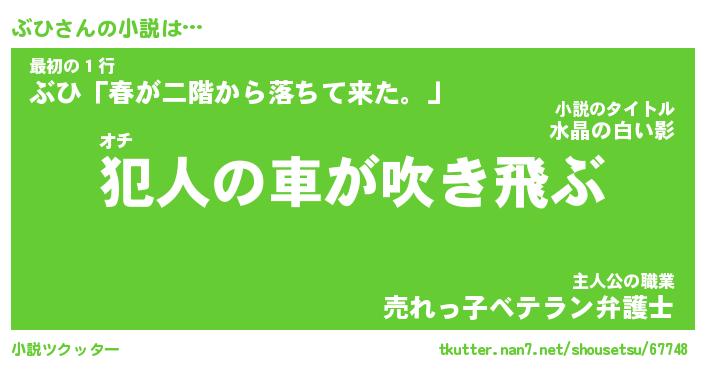 ぶひさんの小説は… オチ『犯人の車が吹き飛ぶ』最初の1行『ぶひ「春が二階から落ちて来た。」』主人公の職業『売れっ子ベテラン弁護士』 ツクッター #小説ツクッター http://tkutter.nan7.net/shousetsu/67748/