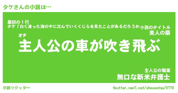 タケさんの小説は… オチ『主人公の車が吹き飛ぶ』最初の1行『タケ「白く凍った海の中に沈んでいくくじらを見たことがあるだろうか。」』主人公の職業『無口な新米弁護士』 ツクッター #小説ツクッター http://tkutter.nan7.net/shousetsu/6776/