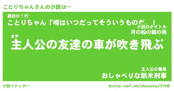 ことりちゃんさんの小説は… オチ『主人公の友達の車が吹き飛ぶ』最初の1行『ことりちゃん「噂はいつだってそういうものだ。」』主人公の職業『おしゃべりな新米刑事』 ツクッター #小説ツクッター http://tkutter.nan7.net/shousetsu/67948/