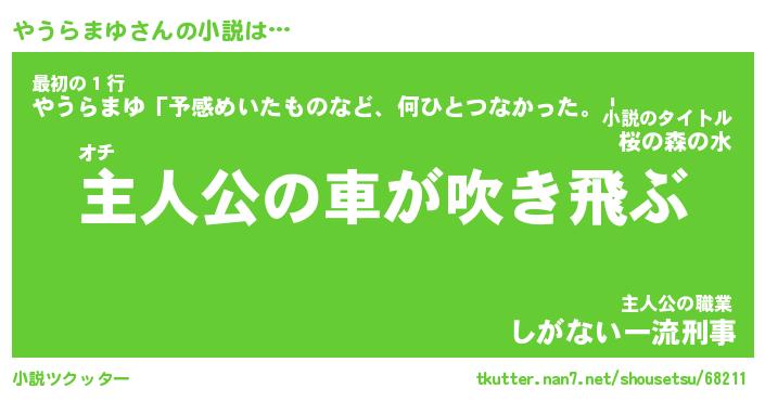 やうらまゆさんの小説は… オチ『主人公の車が吹き飛ぶ』最初の1行『やうらまゆ「予感めいたものなど、何ひとつなかった。」』主人公の職業『しがない一流刑事』 ツクッター #小説ツクッター http://tkutter.nan7.net/shousetsu/68211/