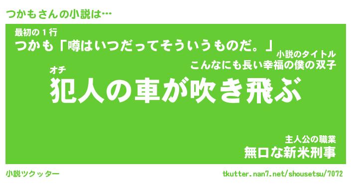 つかもさんの小説は… オチ『犯人の車が吹き飛ぶ』最初の1行『つかも「噂はいつだってそういうものだ。」』主人公の職業『無口な新米刑事』 ツクッター #小説ツクッター http://tkutter.nan7.net/shousetsu/7072/