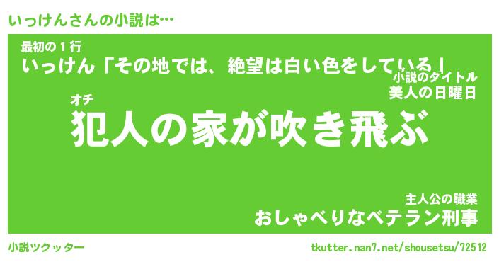いっけんさんの小説は… オチ『犯人の家が吹き飛ぶ』最初の1行『いっけん「その地では、絶望は白い色をしている」』主人公の職業『おしゃべりなベテラン刑事』 ツクッター #小説ツクッター http://tkutter.nan7.net/shousetsu/72512/