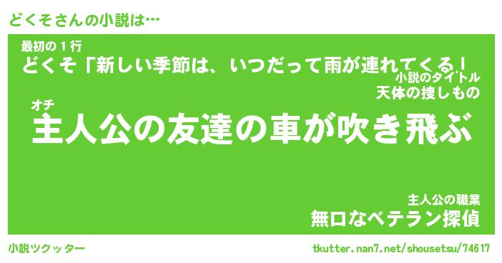 どくそさんの小説は… オチ『主人公の友達の車が吹き飛ぶ』最初の1行『どくそ「新しい季節は、いつだって雨が連れてくる」』主人公の職業『無口なベテラン探偵』 ツクッター #小説ツクッター http://tkutter.nan7.net/shousetsu/74617/