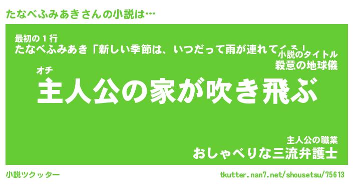たなべふみあきさんの小説は… オチ『主人公の家が吹き飛ぶ』最初の1行『たなべふみあき「新しい季節は、いつだって雨が連れてくる」』主人公の職業『おしゃべりな三流弁護士』 ツクッター #小説ツクッター http://tkutter.nan7.net/shousetsu/75613/