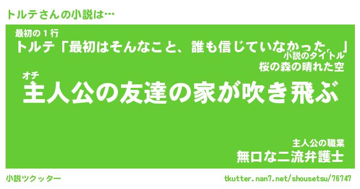 トルテさんの小説は… オチ『主人公の友達の家が吹き飛ぶ』最初の1行『トルテ「最初はそんなこと、誰も信じていなかった。」』主人公の職業『無口な二流弁護士』 ツクッター #小説ツクッター http://tkutter.nan7.net/shousetsu/76747/