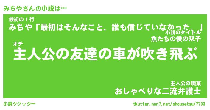 みちやさんの小説は… オチ『主人公の友達の車が吹き飛ぶ』最初の1行『みちや「最初はそんなこと、誰も信じていなかった。」』主人公の職業『おしゃべりな二流弁護士』 ツクッター #小説ツクッター http://tkutter.nan7.net/shousetsu/7703/