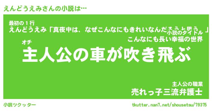 えんどうえみさんの小説は… オチ『主人公の車が吹き飛ぶ』最初の1行『えんどうえみ「真夜中は、なぜこんなにもきれいなんだろうと思う。」』主人公の職業『売れっ子三流弁護士』 ツクッター #小説ツクッター http://tkutter.nan7.net/shousetsu/79375/