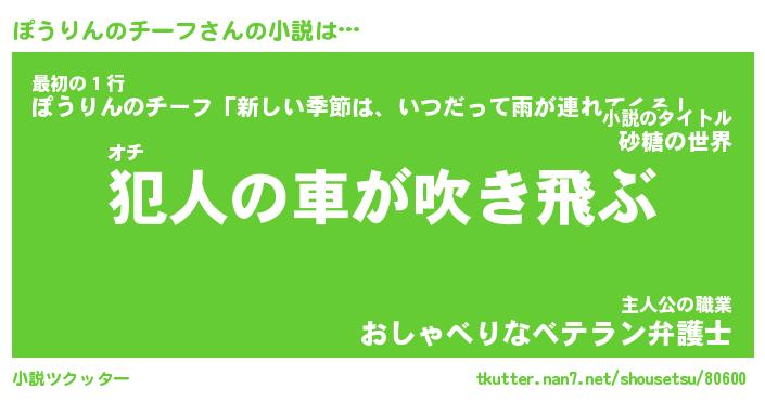 ぽうりんのチーフさんの小説は… オチ『犯人の車が吹き飛ぶ』最初の1行『ぽうりんのチーフ「新しい季節は、いつだって雨が連れてくる」』主人公の職業『おしゃべりなベテラン弁護士』 ツクッター #小説ツクッター http://tkutter.nan7.net/shousetsu/80600/