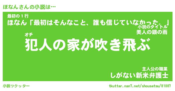 ほなんさんの小説は… オチ『犯人の家が吹き飛ぶ』最初の1行『ほなん「最初はそんなこと、誰も信じていなかった。」』主人公の職業『しがない新米弁護士』 ツクッター #小説ツクッター http://tkutter.nan7.net/shousetsu/81007/