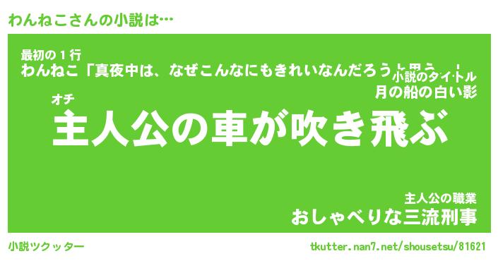わんねこさんの小説は… オチ『主人公の車が吹き飛ぶ』最初の1行『わんねこ「真夜中は、なぜこんなにもきれいなんだろうと思う。」』主人公の職業『おしゃべりな三流刑事』 ツクッター #小説ツクッター http://tkutter.nan7.net/shousetsu/81621/