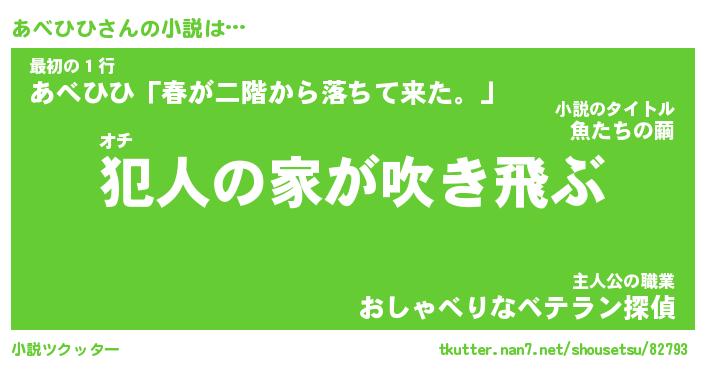 あべひひさんの小説は… オチ『犯人の家が吹き飛ぶ』最初の1行『あべひひ「春が二階から落ちて来た。」』主人公の職業『おしゃべりなベテラン探偵』 ツクッター #小説ツクッター http://tkutter.nan7.net/shousetsu/82793/