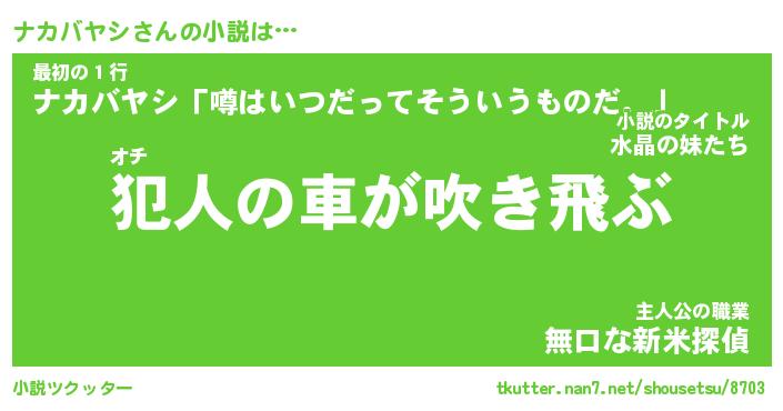 ナカバヤシさんの小説は… オチ『犯人の車が吹き飛ぶ』最初の1行『ナカバヤシ「噂はいつだってそういうものだ。」』主人公の職業『無口な新米探偵』 ツクッター #小説ツクッター http://tkutter.nan7.net/shousetsu/8703/