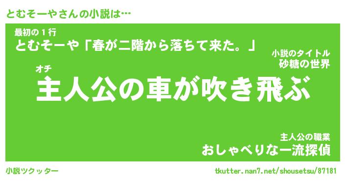 | 男性向けラノベタイトル風あだ名 | 『とむそーやの憂鬱』 |