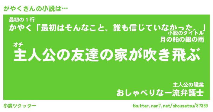 かやくさんの小説は… オチ『主人公の友達の家が吹き飛ぶ』最初の1行『かやく「最初はそんなこと、誰も信じていなかった。」』主人公の職業『おしゃべりな一流弁護士』 ツクッター #小説ツクッター http://tkutter.nan7.net/shousetsu/87339/