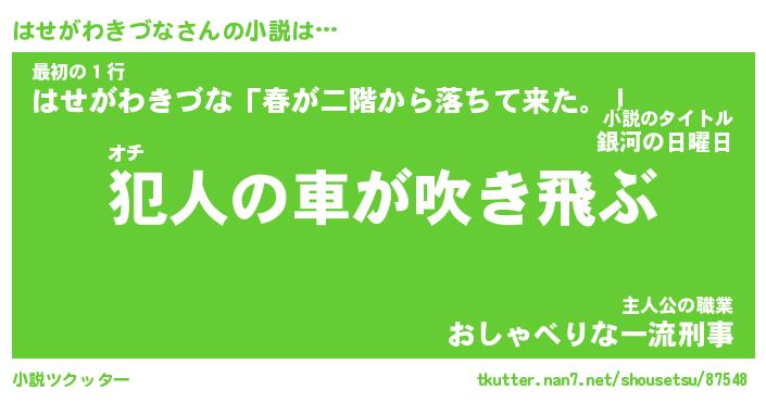 はせがわきづなさんの小説は… オチ『犯人の車が吹き飛ぶ』最初の1行『はせがわきづな「春が二階から落ちて来た。」』主人公の職業『おしゃべりな一流刑事』 ツクッター #小説ツクッター http://tkutter.nan7.net/shousetsu/87548/