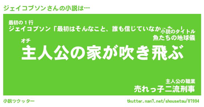 ジェイコブソンさんの小説は… オチ『主人公の家が吹き飛ぶ』最初の1行『ジェイコブソン「最初はそんなこと、誰も信じていなかった。」』主人公の職業『売れっ子二流刑事』 ツクッター #小説ツクッター http://tkutter.nan7.net/shousetsu/87994/