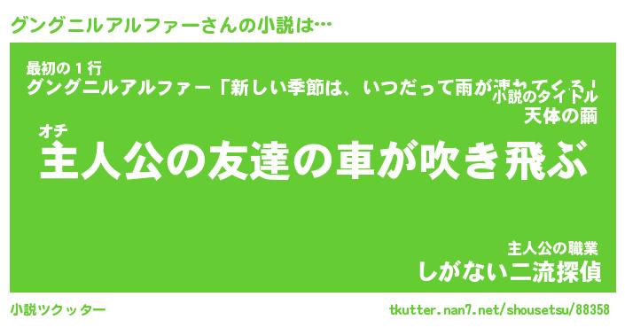 グングニルアルファーさんの小説は… オチ『主人公の友達の車が吹き飛ぶ』最初の1行『グングニルアルファー「新しい季節は、いつだって雨が連れてくる」』主人公の職業『しがない二流探偵』 ツクッター #小説ツクッター http://tkutter.nan7.net/shousetsu/88358/
