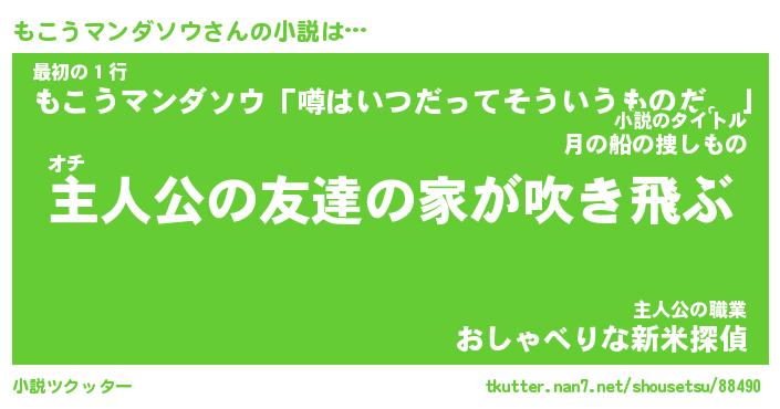 | 男性向けラノベタイトル風あだ名 | 『もこうマンダソウの憂鬱』 |