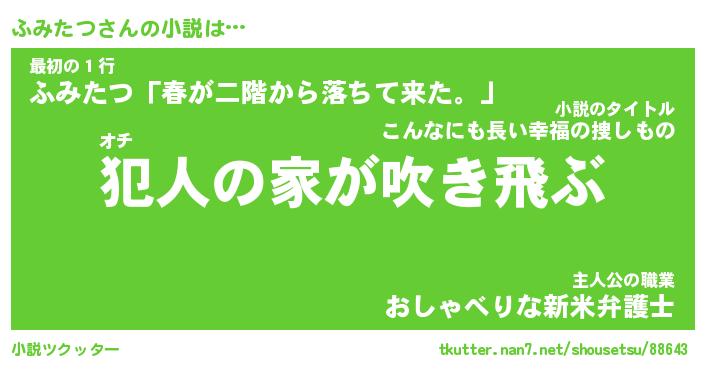 ふみたつさんの小説は… オチ『犯人の家が吹き飛ぶ』最初の1行『ふみたつ「春が二階から落ちて来た。」』主人公の職業『おしゃべりな新米弁護士』 ツクッター #小説ツクッター http://tkutter.nan7.net/shousetsu/88643/