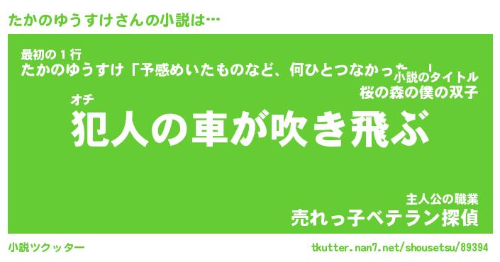たかのゆうすけさんの小説は… オチ『犯人の車が吹き飛ぶ』最初の1行『たかのゆうすけ「予感めいたものなど、何ひとつなかった。」』主人公の職業『売れっ子ベテラン探偵』 ツクッター #小説ツクッター http://tkutter.nan7.net/shousetsu/89394/