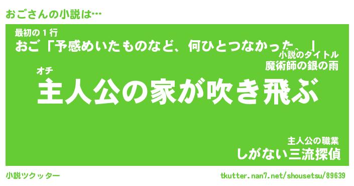 おごさんの小説は… オチ『主人公の家が吹き飛ぶ』最初の1行『おご「予感めいたものなど、何ひとつなかった。」』主人公の職業『しがない三流探偵』 ツクッター #小説ツクッター http://tkutter.nan7.net/shousetsu/89639/