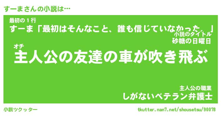 すーまさんの小説は… オチ『主人公の友達の車が吹き飛ぶ』最初の1行『すーま「最初はそんなこと、誰も信じていなかった。」』主人公の職業『しがないベテラン弁護士』 ツクッター #小説ツクッター http://tkutter.nan7.net/shousetsu/90078/