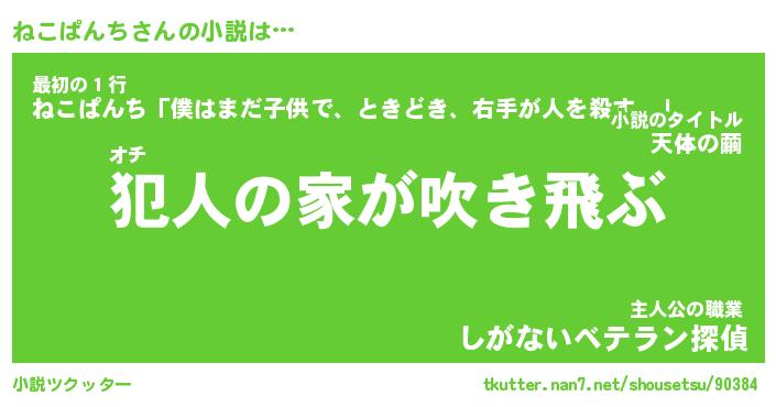 ねこぱんちさんの小説は… オチ『犯人の家が吹き飛ぶ』最初の1行『ねこぱんち「僕はまだ子供で、ときどき、右手が人を殺す。」』主人公の職業『しがないベテラン探偵』 ツクッター #小説ツクッター http://tkutter.nan7.net/shousetsu/90384/