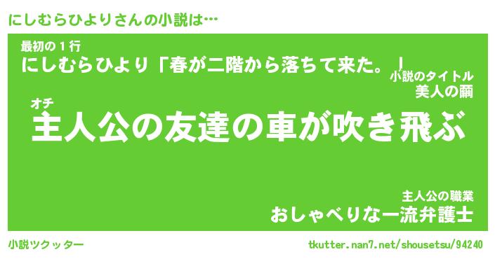 | 胡散臭い通販商品みたいなあだ名 | 『億万長者になれるブレスレット…その名も「にしむらひより」』 |