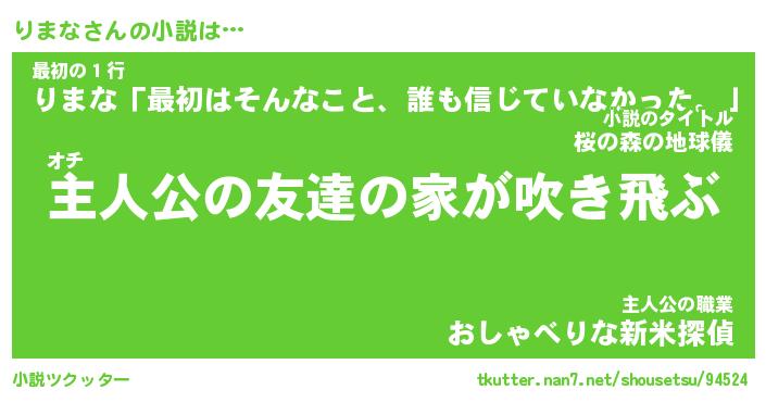 りまなさんの小説は… オチ『主人公の友達の家が吹き飛ぶ』最初の1行『りまな「最初はそんなこと、誰も信じていなかった。」』主人公の職業『おしゃべりな新米探偵』 ツクッター #小説ツクッター http://tkutter.nan7.net/shousetsu/94524/