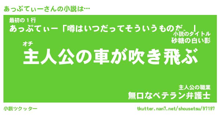 あっぷてぃーさんの小説は… オチ『主人公の車が吹き飛ぶ』最初の1行『あっぷてぃー「噂はいつだってそういうものだ。」』主人公の職業『無口なベテラン弁護士』 ツクッター #小説ツクッター http://tkutter.nan7.net/shousetsu/97197/