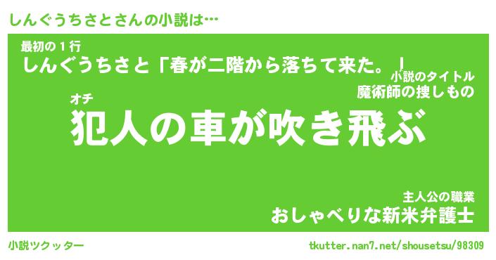 しんぐうちさとさんの小説は… オチ『犯人の車が吹き飛ぶ』最初の1行『しんぐうちさと「春が二階から落ちて来た。」』主人公の職業『おしゃべりな新米弁護士』 ツクッター #小説ツクッター http://tkutter.nan7.net/shousetsu/98309/