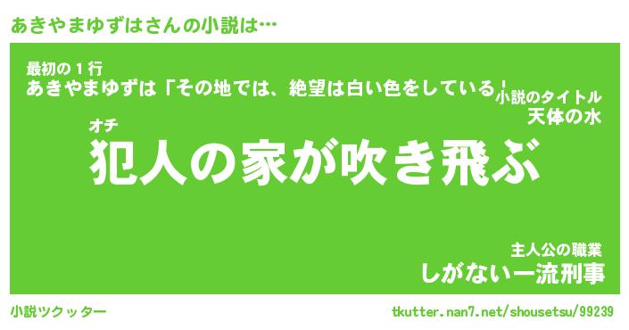 あきやまゆずはさんの小説は… オチ『犯人の家が吹き飛ぶ』最初の1行『あきやまゆずは「その地では、絶望は白い色をしている」』主人公の職業『しがない一流刑事』 ツクッター #小説ツクッター http://tkutter.nan7.net/shousetsu/99239/