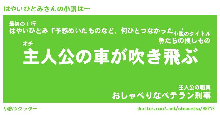 はやいひとみさんの小説は… オチ『主人公の車が吹き飛ぶ』最初の1行『はやいひとみ「予感めいたものなど、何ひとつなかった。」』主人公の職業『おしゃべりなベテラン刑事』 ツクッター #小説ツクッター http://tkutter.nan7.net/shousetsu/99273/