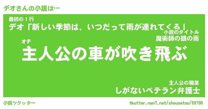 デオさんの小説は… オチ『主人公の車が吹き飛ぶ』最初の1行『デオ「新しい季節は、いつだって雨が連れてくる」』主人公の職業『しがないベテラン弁護士』 ツクッター #小説ツクッター http://tkutter.nan7.net/shousetsu/99796/