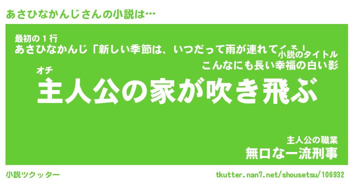 あさひなかんじさんの小説は… オチ『主人公の家が吹き飛ぶ』最初の1行『あさひなかんじ「新しい季節は、いつだって雨が連れてくる」』主人公の職業『無口な一流刑事』 ツクッター #小説ツクッター http://tkutter.nan7.net/shousetsu/106932/