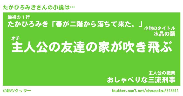 たかひろみきさんの小説は… オチ『主人公の友達の家が吹き飛ぶ』最初の1行『たかひろみき「春が二階から落ちて来た。」』主人公の職業『おしゃべりな三流刑事』 ツクッター #小説ツクッター http://tkutter.nan7.net/shousetsu/213511/
