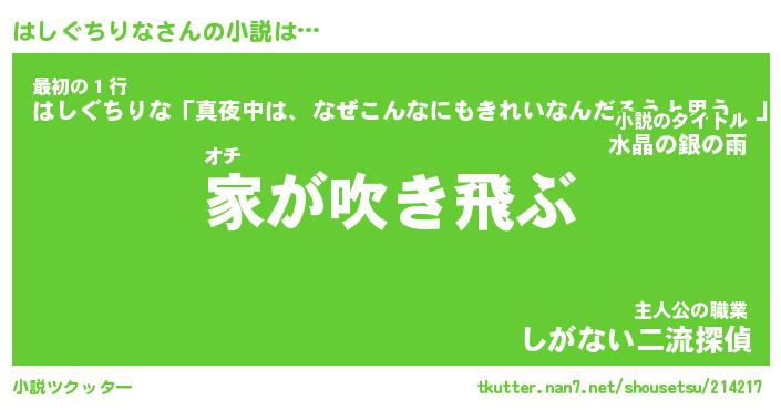 はしぐちりなさんの小説は… オチ『家が吹き飛ぶ』最初の1行『はしぐちりな「真夜中は、なぜこんなにもきれいなんだろうと思う。」』主人公の職業『しがない二流探偵』 ツクッター #小説ツクッター http://tkutter.nan7.net/shousetsu/214217/