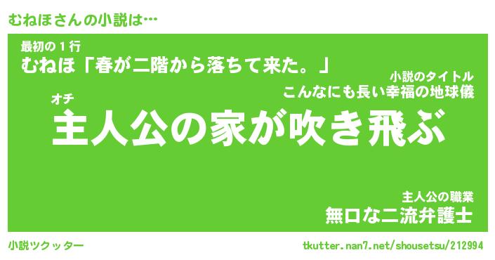 むねほさんの小説は… オチ『主人公の家が吹き飛ぶ』最初の1行『むねほ「春が二階から落ちて来た。」』主人公の職業『無口な二流弁護士』 ツクッター #小説ツクッター http://tkutter.nan7.net/shousetsu/212994/