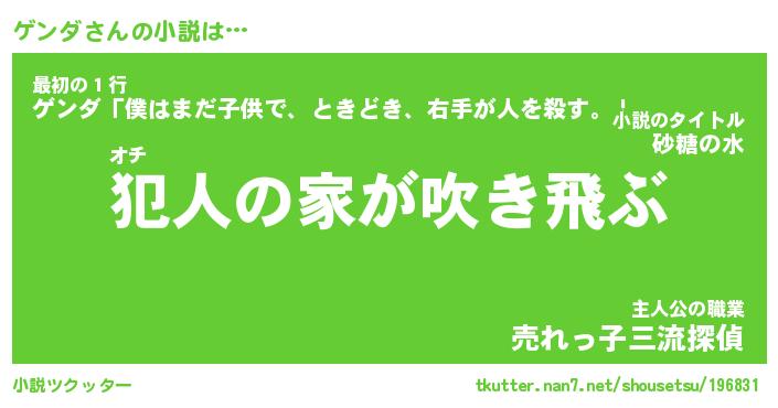 ゲンダさんの小説は… オチ『犯人の家が吹き飛ぶ』最初の1行『ゲンダ「僕はまだ子供で、ときどき、右手が人を殺す。」』主人公の職業『売れっ子三流探偵』 ツクッター #小説ツクッター http://tkutter.nan7.net/shousetsu/196831/