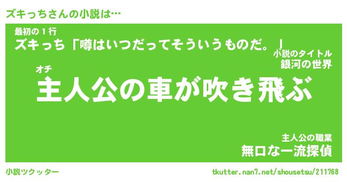 ズキっちさんの小説は… オチ『主人公の車が吹き飛ぶ』最初の1行『ズキっち「噂はいつだってそういうものだ。」』主人公の職業『無口な一流探偵』 ツクッター #小説ツクッター http://tkutter.nan7.net/shousetsu/211768/