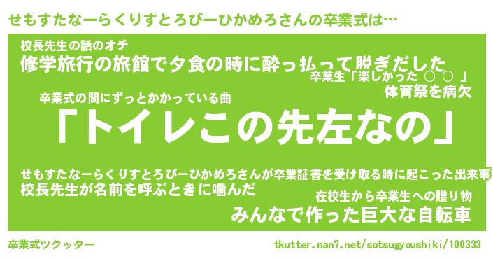 | 男性向けラノベタイトル風あだ名 | 『せもすたなーらくりすとろびーひかめろの憂鬱』 |