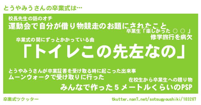 | 胡散臭い通販商品みたいなあだ名 | 『必ず成功するブレスレット…その名も「とうやみう」』 |