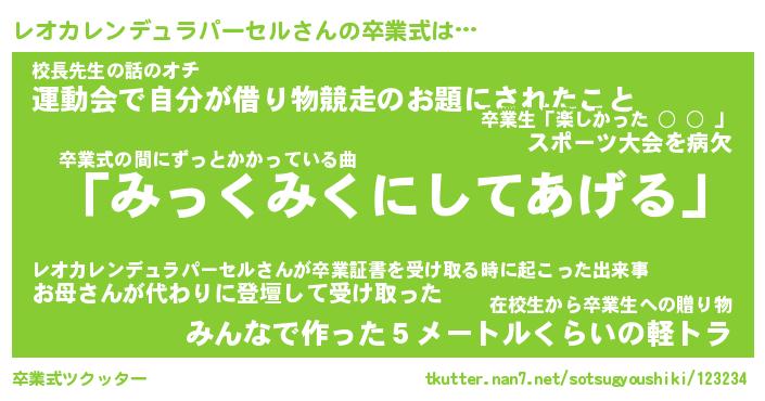 | 伝説のあだ名 | 『伝説のスナイパーレオカレンデュラパーセル』 |