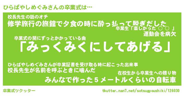 | 伝説のあだ名 | 『伝説のスナイパーひらばやしめぐみ』 |