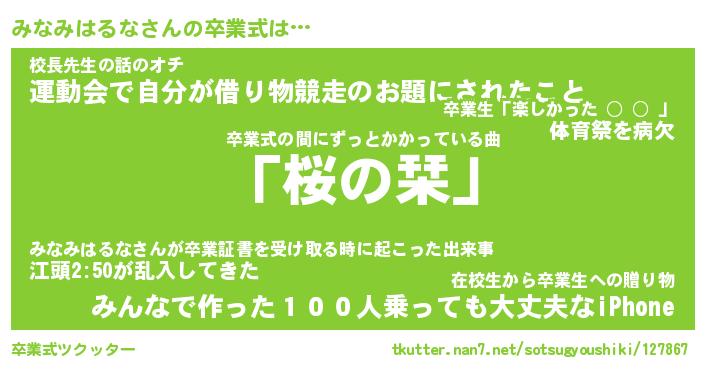 | 伝説のあだ名 | 『封印されしスナイパーみなみはるな』 |