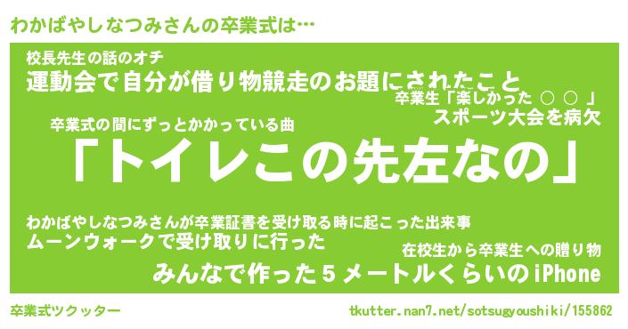 | 胡散臭い通販商品みたいなあだ名 | 『必ず成功するブレスレット…その名も「わかばやしなつみ」』 |